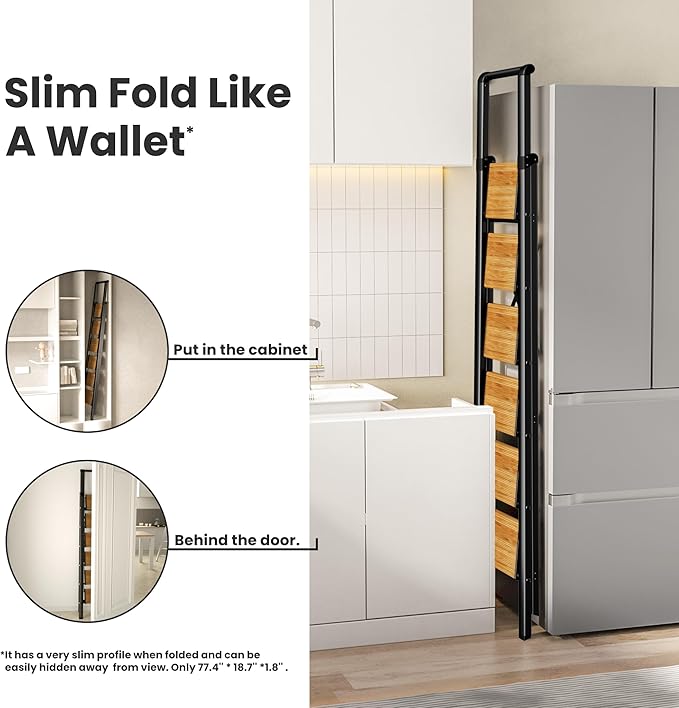 - Folds Slim to 2.2 '' Like A Wallet: It's very simple to open and close. The step ladder has a very slim profile when folded, so you can tuck it away in a small space and can be easily hidden away from view
