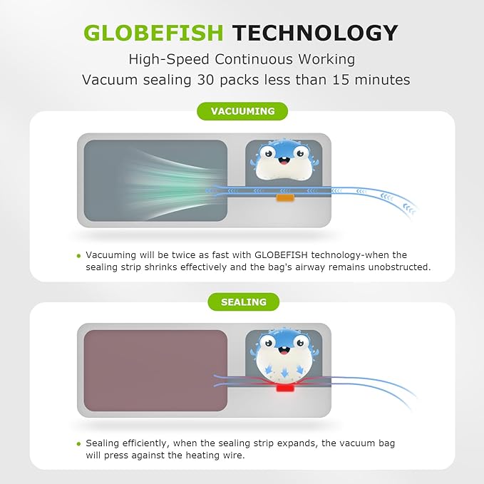 - Excellent Performance: Vacuum sealer for food combines powerful suction with unique airtight technology for faster and more efficient vacuuming and sealing. It only takes 15 minutes to continuously vacuum and seal 30 bags, saving you time when processing large quantities of food