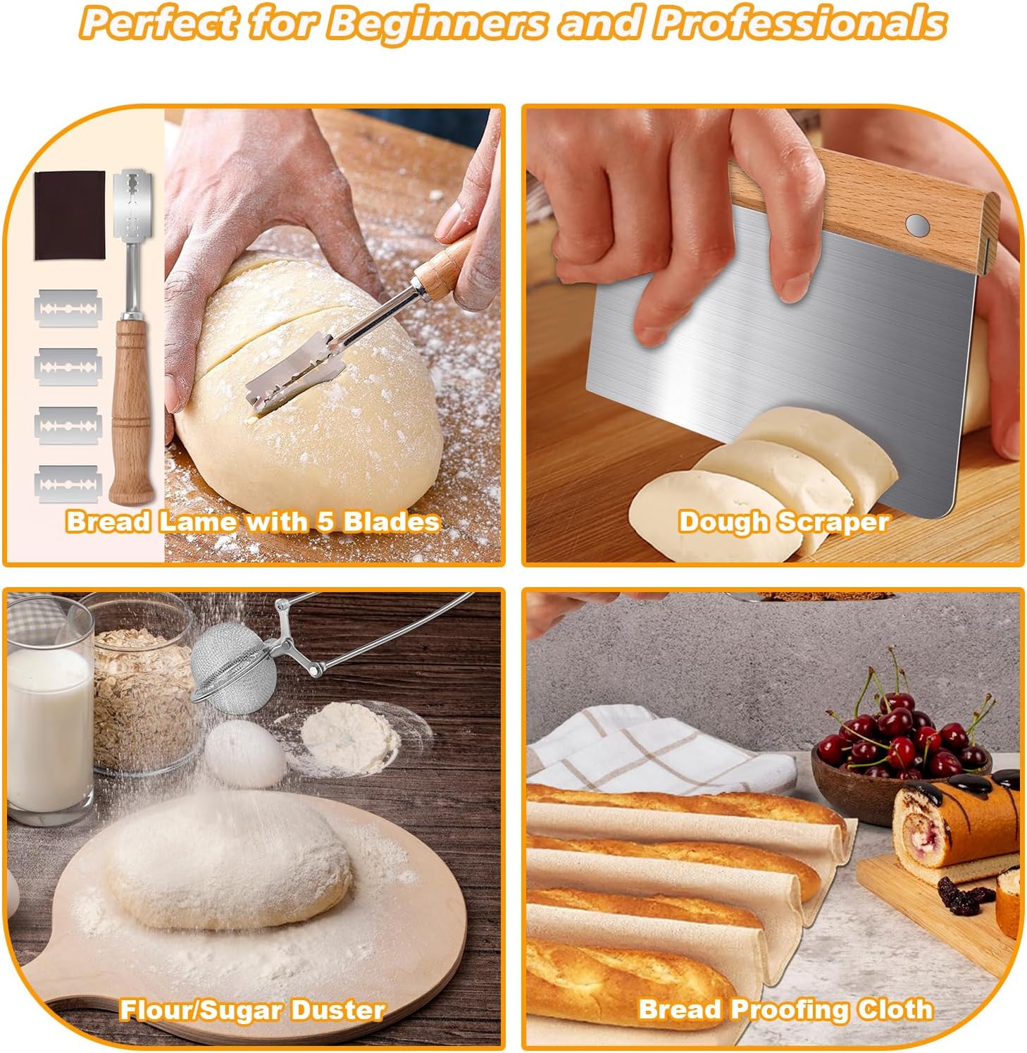 - Premium Baking Accessories: The dough scraper and dough scraper are designed with ergonomically designed premium wooden handles which are ideal for cutting, scraping and transferring bread dough. A premium wood handle scoring lame (with 5 blades and leather cover) enable you to make wonderful patterns on the bread surface