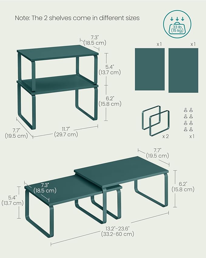 - [Adjustable] With their unique design, with one slightly smaller than the other, these shelf organizers can be stacked on top of one another, nested, used separately, or even in an L-shape. Adjust them how you want to perfectly fit your kitchen space