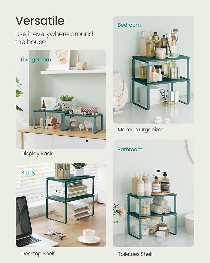SONGMICS Cabinet Organizer Shelf, Set of 2 Kitchen Counter Shelves, Kitchen Storage, Spice Rack, Stackable, Expandable, Metal and Engineered Wood, MARRS Green UKCS002C02