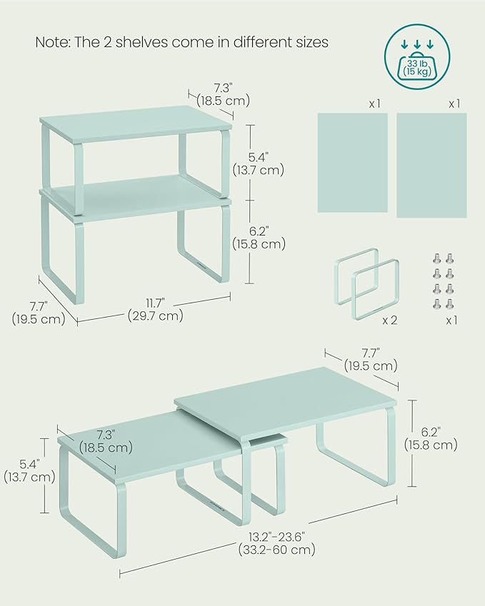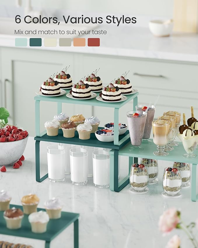 SONGMICS Cabinet Organizer Shelf, Set of 2 Kitchen Counter Shelves, Kitchen Storage, Spice Rack, Stackable, Expandable, Metal and Engineered Wood, Moonlight Green UKCS002C01