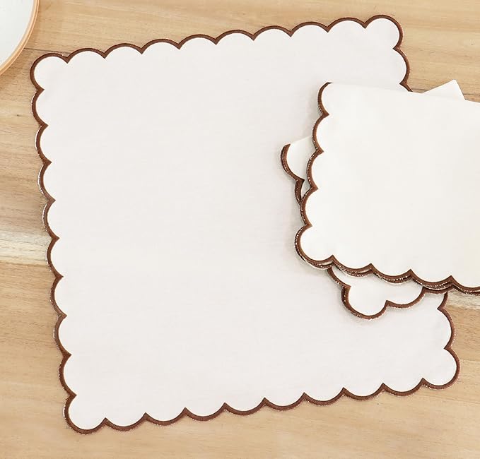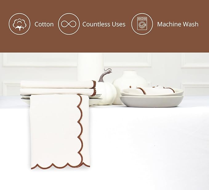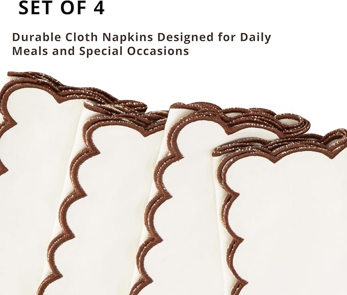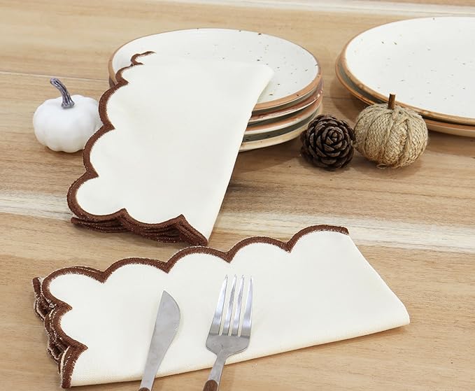 PurpleEssences Scalloped Embroidery Cloth Napkins Christmas Holiday Winter Table Decor 100% Cotton Set of 4-18 x 18 inch - Beige - Edges - Brown