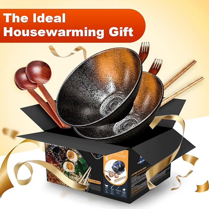 - LARGE CAPACITY: The YTLEMON Ramen Bowl Set contains 2 ceramic bowl of 1000ml/34oz capacity, 2 wooden Forks and ramen spoons, 2 pairs of wooden chopsticks.Each pasta bowl measures 20.3 cm/8 inches in diameter and 8.2 cm/3.15 inches in height. Comes with 1000DAYS electronic ramen cookbook for you