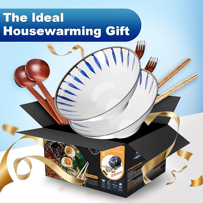 - LARGE CAPACITY: The YTLEMON Ramen Bowl Set contains 2 ceramic bowl of 1000ml/34oz capacity, 2 wooden Forks and ramen spoons, 2 pairs of wooden chopsticks.Each pasta bowl measures 20.3 cm/8 inches in diameter and 8.2 cm/3.15 inches in height. Comes with 1000DAYS electronic ramen cookbook for you