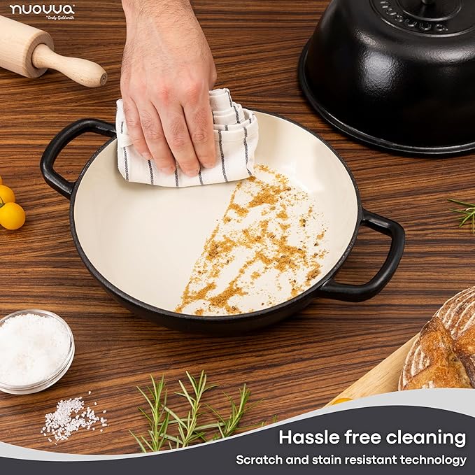 - ENAMELLED FINISH: The enamelled surface of the cast iron dutch oven pot by Nuovva is non-reactive, making it safe for all types of dough and ingredients. It resists rust and scratches, ensuring your pot remains in pristine condition for years. The smooth enamelled finish makes cleaning effortless!