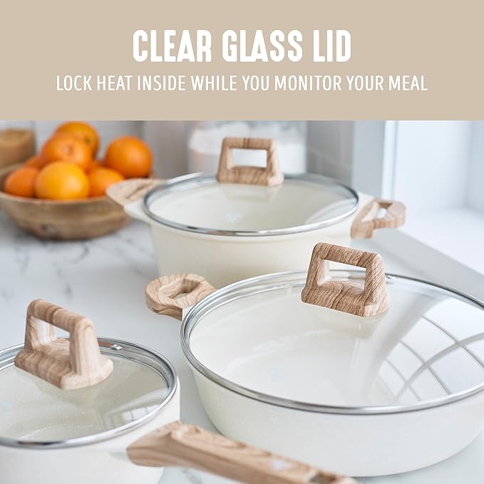 - COMPLETE NONSTICK COOKWARE SET WITH LIDS: Includes 8” and 9.5” frying pans, 1.37QT saucepan with lid, 4.65QT stockpot with lid, and 4.12QT sauté pan with lid—everything you need for daily cooking tasks like sautéing, simmering, boiling, and searing.