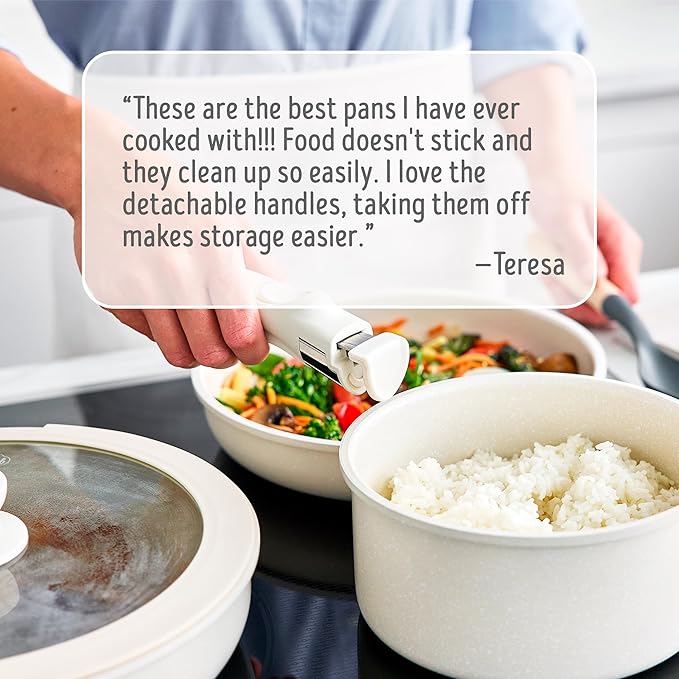 - DETACHABLE HANDLES: Each pan features stay-cool removable handles – just click on to cook and transfer then click off to serve and store.