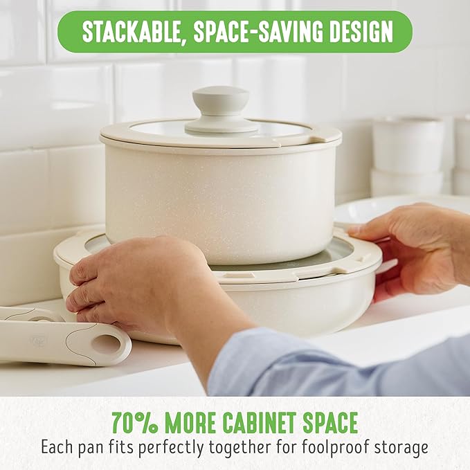 GreenLife 10 Piece Nonstick Pots & Pans Set, Detachable Handle & Stackable Cookware Set, Non Toxic PFAS-Free Skillets, Induction Kitchen Pans, Space Saving, Serving Bowls, Oven Safe, Speckled Cream