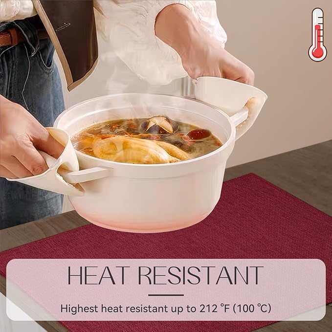 - THICKENED AND HEAT-RESISTANT: Our placemats feature a double-layered faux linen fabric which is heat-resistant up to 220°F (100°C) . They will prevent hot dishes, stains, and scratches from damaging your tables or furniture.