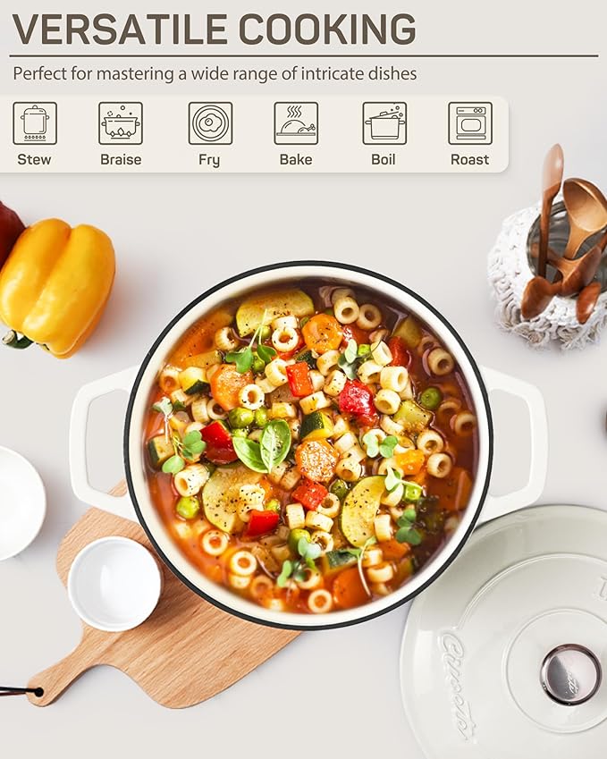 - Versatile Cooking Solution: The Ciwete 6 Quart dutch oven offers ample cooking space, perfect for large family meals and everyday culinary needs. Whether you’re stewing soup, braising meat, or baking bread, this dutch oven is your reliable kitchen companion for creating a variety of delicious dishes