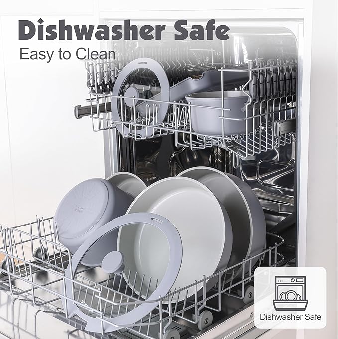 - Dishwasher Safe - Cleaning is a breeze. Professional wear-resistant design for the bottom of the pan set that prevents black residue even when used in the dishwasher.