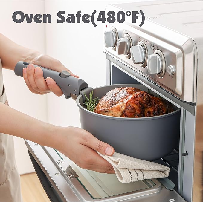 - Easy Storage - Save up to 70% more space with stackable pots and pans set and detachable handles, allowing for storage in cabinets or RVs