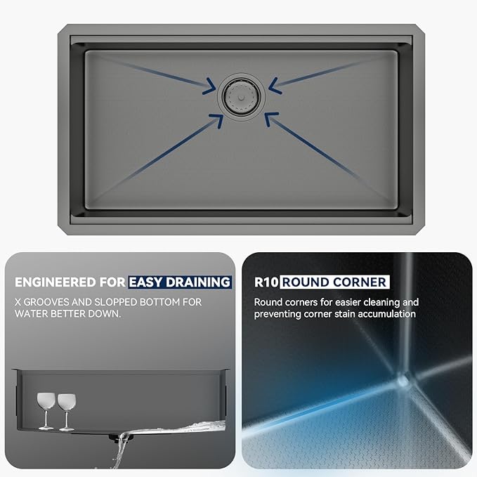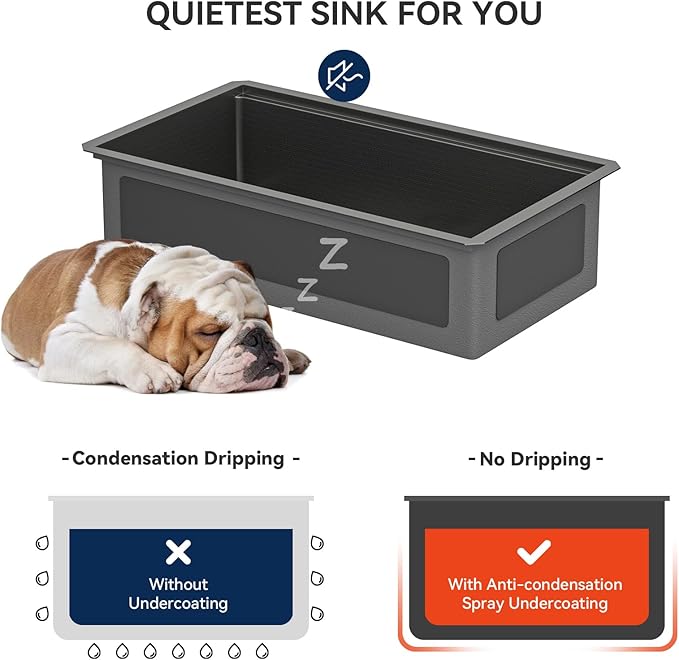- [ About Soundproofing]: Engineered with sound-absorbing pads and a full body coating, this sink minimizes noise and vibration, creating a quieter kitchen environment. The protective coating prevents condensation, preserving your cabinet base from moisture damage and ensuring a peaceful cooking experience at any time of day.