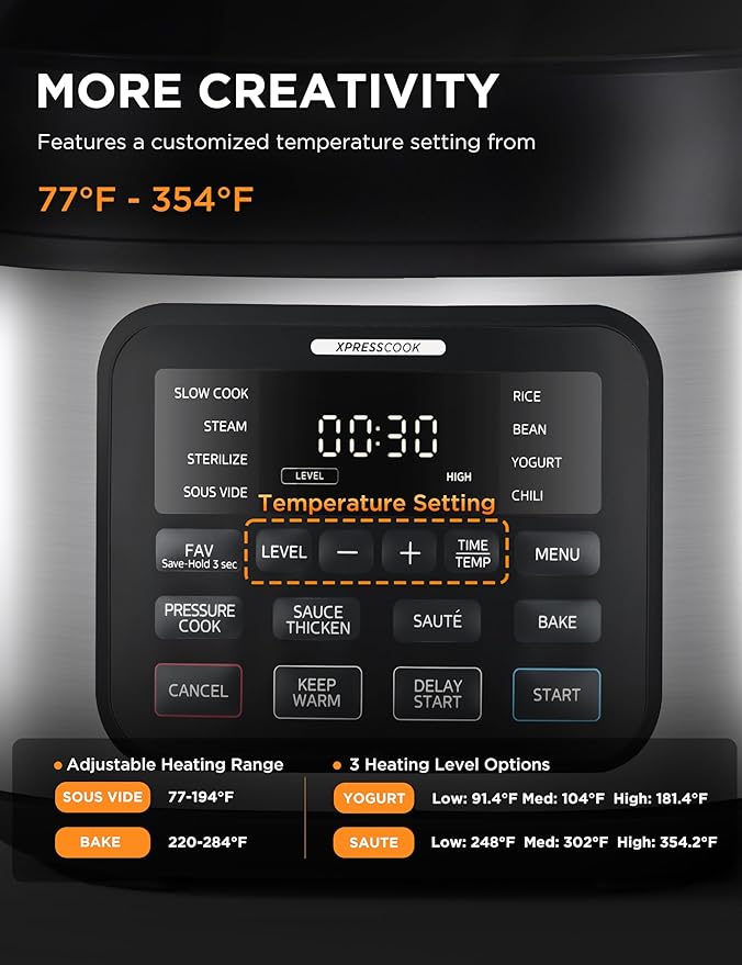 - 12 COOKING FUNCTIONS: Pressure cooking, slow cooking, sauce thicken, bean, sauté, yogurt, bake, sous vide,chili, rice, steam, sterilize and keep warm