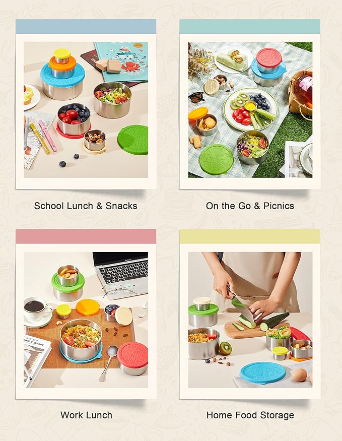 - Leak-Proof Silicone Lids: These lids are flexible, easy to remove. The food-grade silicone lids seal tightly to prevent spills and keep food fresh, even liquids like soups and dressings.