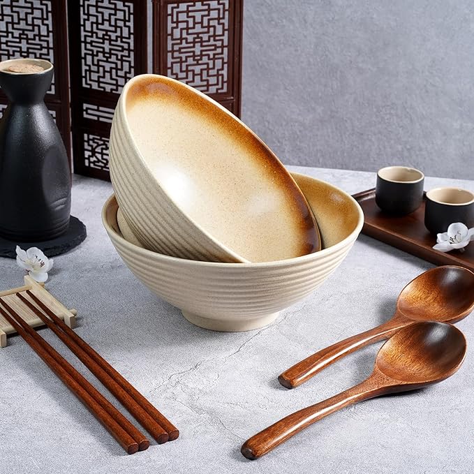 NUTRIUPS 8 Inch Ceramic Ramen Bowl Set of 2 Pho Bowls Japanese Noodle Udon Soup Bowls with Spoons and Chopsticks (Wheat Gold)