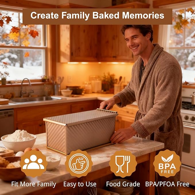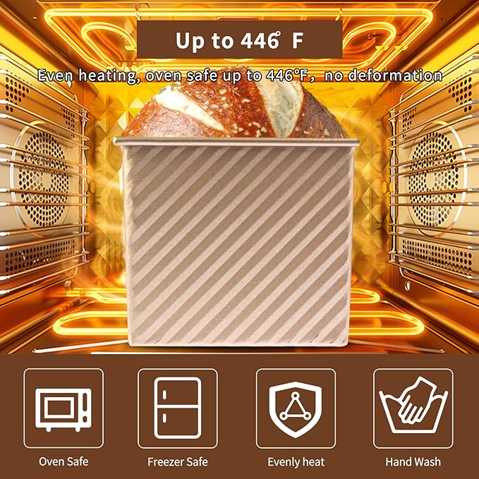 - Oven Safe and Heat Resistant: Our gold covered pullman loaf pan with lid is made of heavy-duty carbon steel, ensuring it can withstand oven temperatures up to 446°F. Enjoy uniform heating without warping
