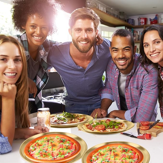 - Package Contents: there are 8 pieces of stainless steel plates in gold color, the sufficient amount can meet your daily use and replacement. not just for oven use, our pizza pans can also be applied for serving your delicious creations. invest in the Stainless Steel Pizza Pans today and experience the ease of baking and serving your favorite pizza creations