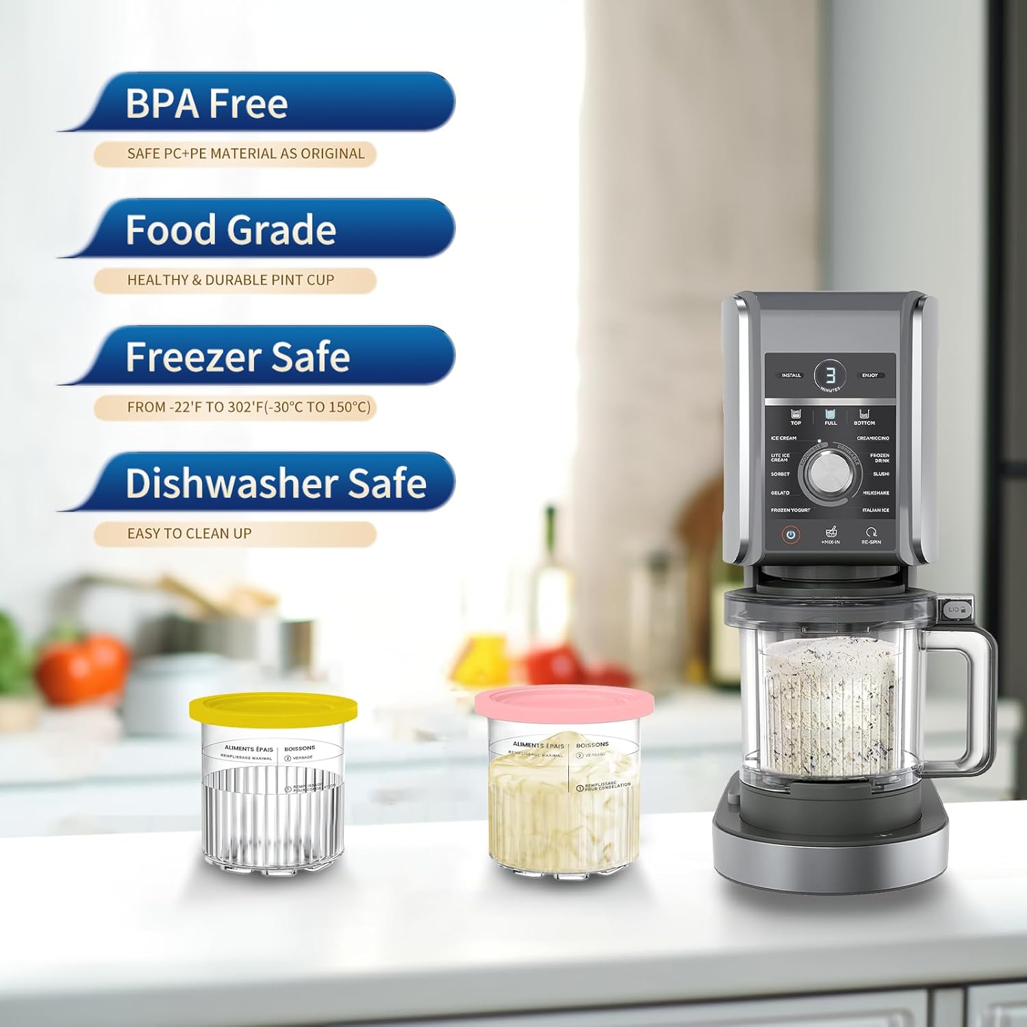- š Premium Quality: Durable and sturdy pints are made of food-grade, BPA-free materials. Upgraded sealing lids help store ice cream, yogurt, sorbet frozen food freshness and prevent spills or leaks. Easily transforms to a soft, creamy texture in just minutes.