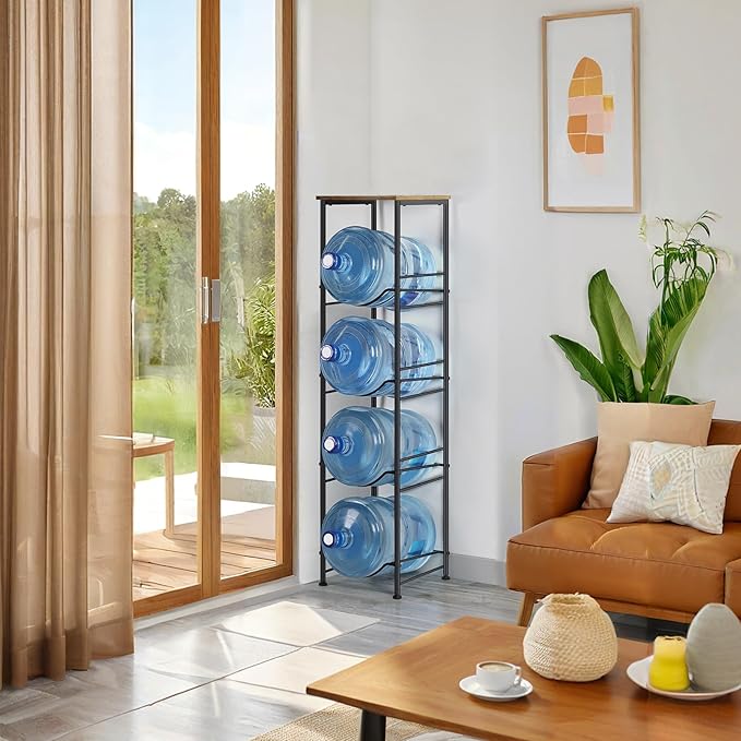 Vrisa 5 Gallon Water Jug Holder 4-Tier Water Bottle Holder Water Jug Stand with Storage Shelf Water 3/5 Gallon Rack Organizer for Home Office, Rustic Brown