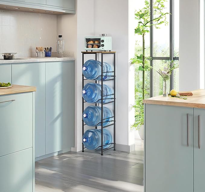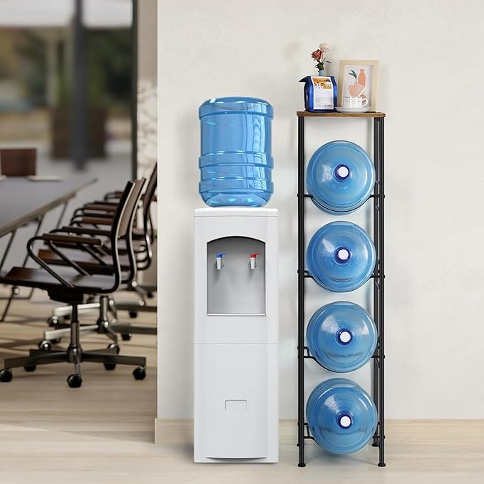 - 【Sturdy & Durable】Constructed with reinforced metal tubes and sturdy black-painted steel, this 5-gallon water jug holder is stable, durable, and corrosion-resistant, guaranteeing long-lasting reliability and strength,with at least 20kg/44lbs bearing per tier.