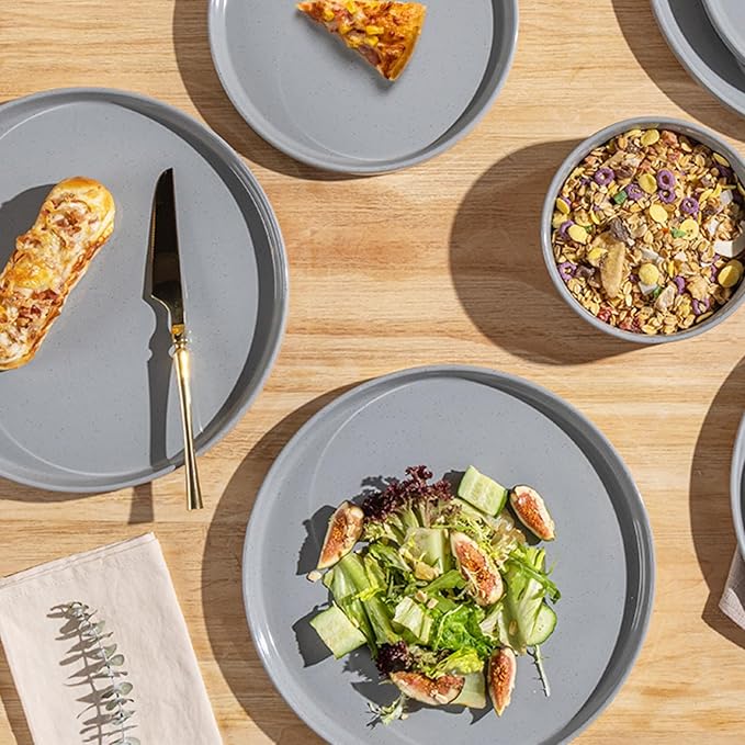 - Stackable & Less Space: the stackable dinnerware set creates a Rustic and minimalist table setting.The shape is great as it makes. they are easier to handle and hold and they stack really well without taking up much space,stack and nestle nicely in your cupboard or shelves.Our Dinnerware set is microwave,dishwasher and freezer safe,Perfect for every day use, indoors or out; ideal for any kitchen let your food look even more delicious, and make you happy every day.