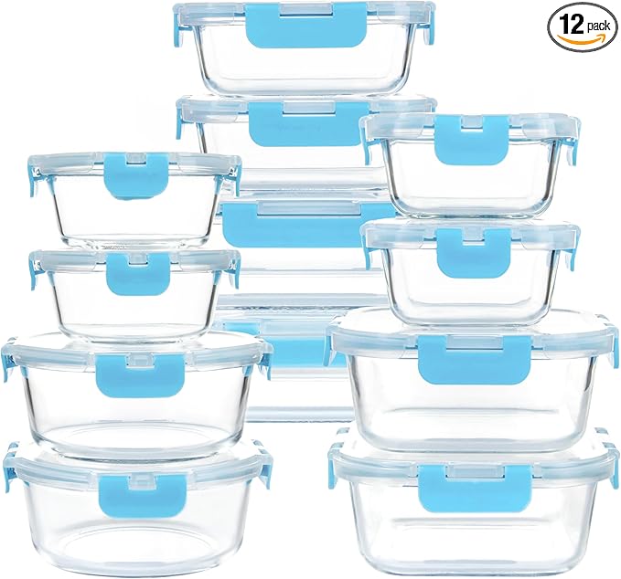 12 Pack Glass Storage Containers with Lids, Glass Meal Prep Containers Set, Airtight Food Storage Containers, Blue