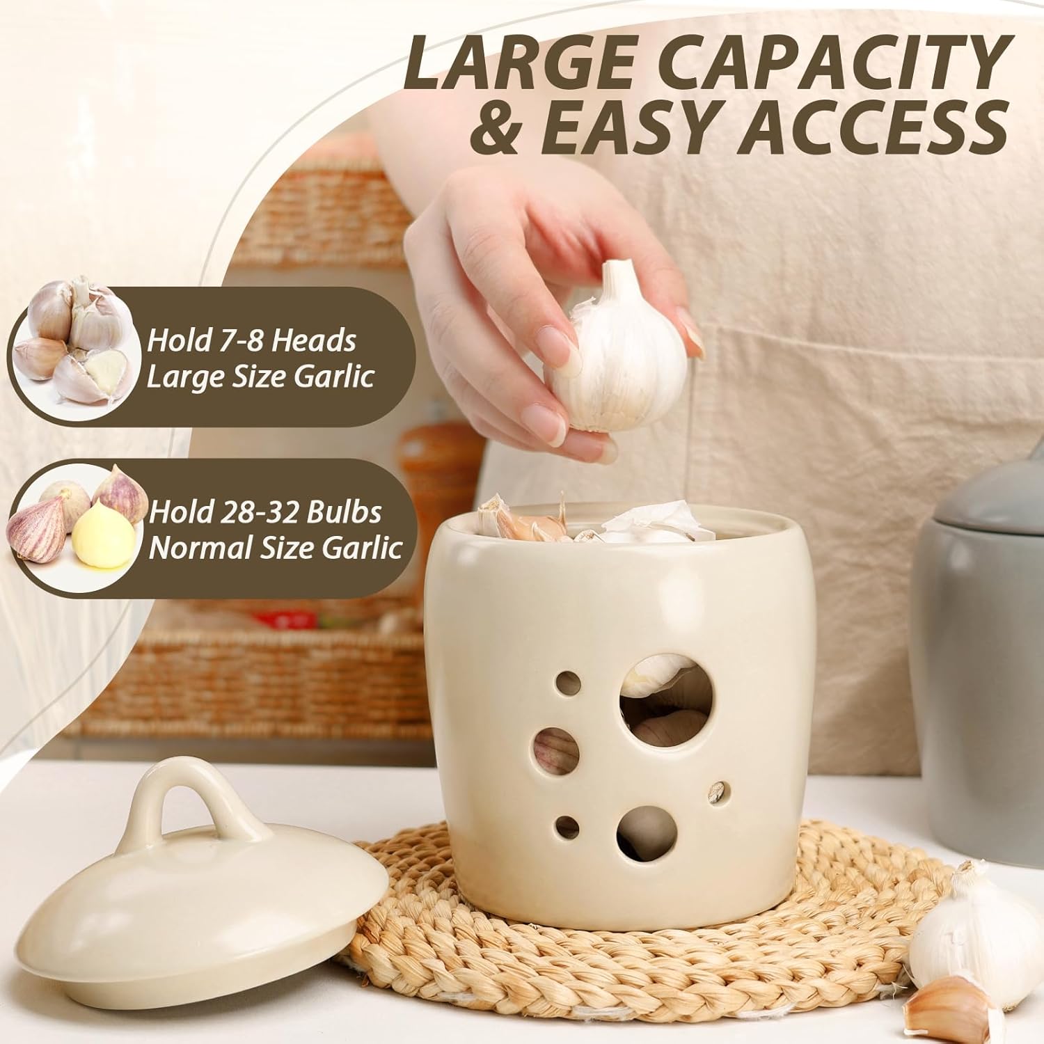 - Large Opening for Convenience: The wide mouth design allows for easy access when placing or removing garlic, and makes cleaning a breeze, making it perfect for daily use