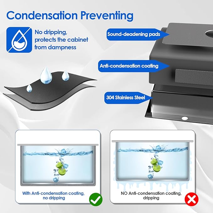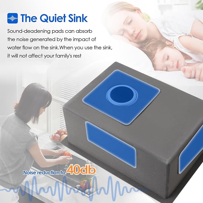- 【Sound-proof Kitchen Sink】Sound-absorption undercoating and sound-dampening rubber pads made this quietest sink. Benefits: ① Minimizes water drumping sound and reduces vibration; ② Reduces condensation on the underside of sink, keeps cabinets dry and clean