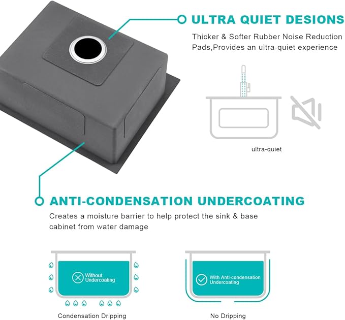 - 【Sound and Condensation Damping Design】This stainless steel undermount kitchen sink has extra thick rubber dampening pads to minimize noise and heavy duty stone guard undercoating to prevent condensation and protect kitchen cabinets