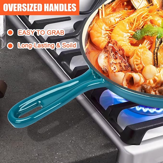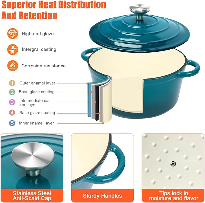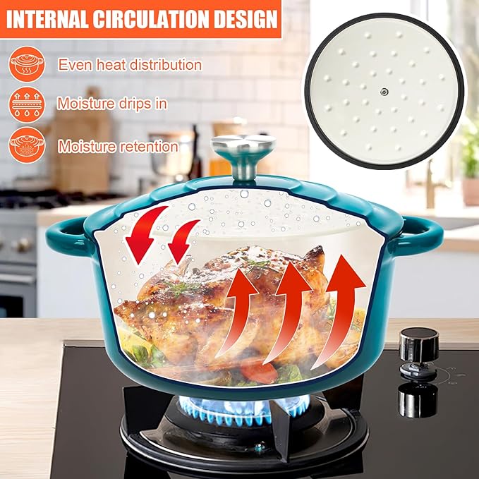 - đ„ăHeat Retention & Even HeatingăThe cast iron's unique design spreads heat evenly from bottom to sides. No more hot spots or half-cooked meals. Tight-fitting lids lock in moisture, yielding tender pot roasts and flavorful stews. It stays warm post-heating, so you can serve seconds hassle-free