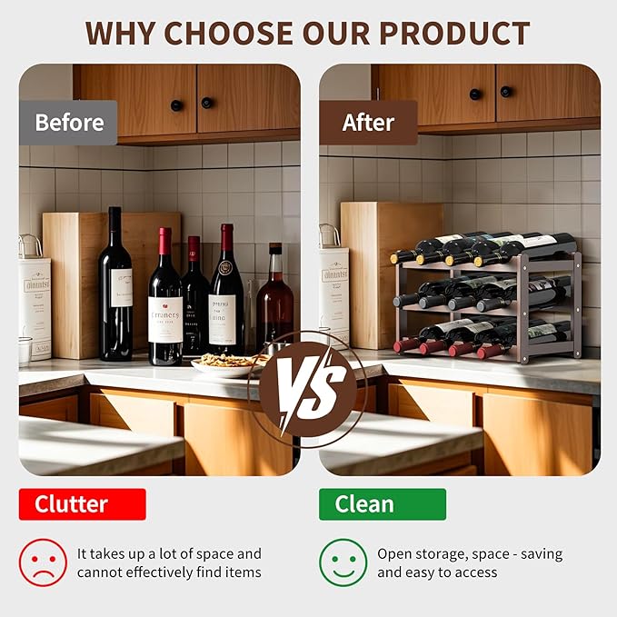 - 【PERFECT SIZE】Wine rack countertop holds up to 12 bottles of wine (3 tiers, 4 bottles per tier) 3.3" opening accommodates standard size 750ml wine bottles. Assembled dimensions: 16.93" long x 9.45" wide x 10.63" high. These wine racks and wine cabinets are the perfect size for small bar areas or other small spaces and make a great addition to your home