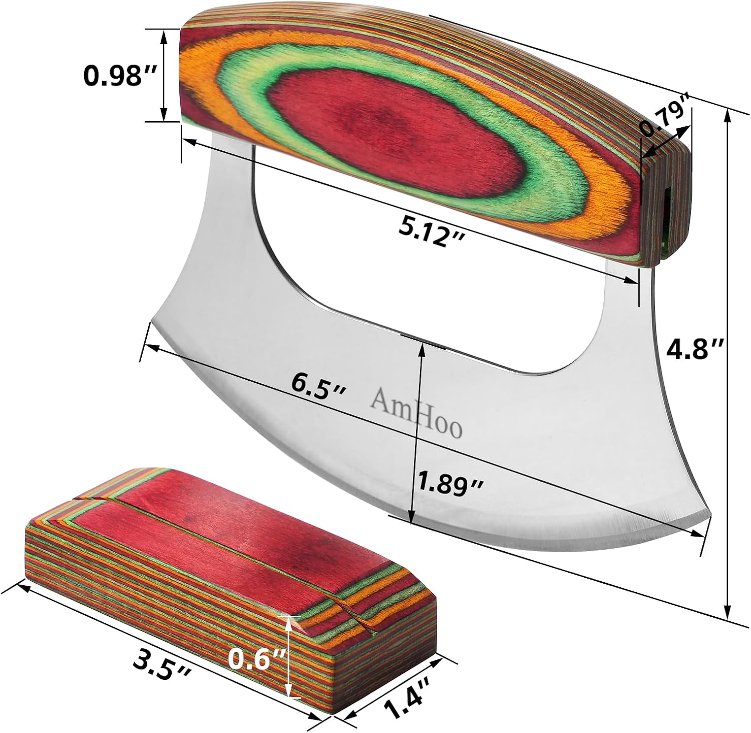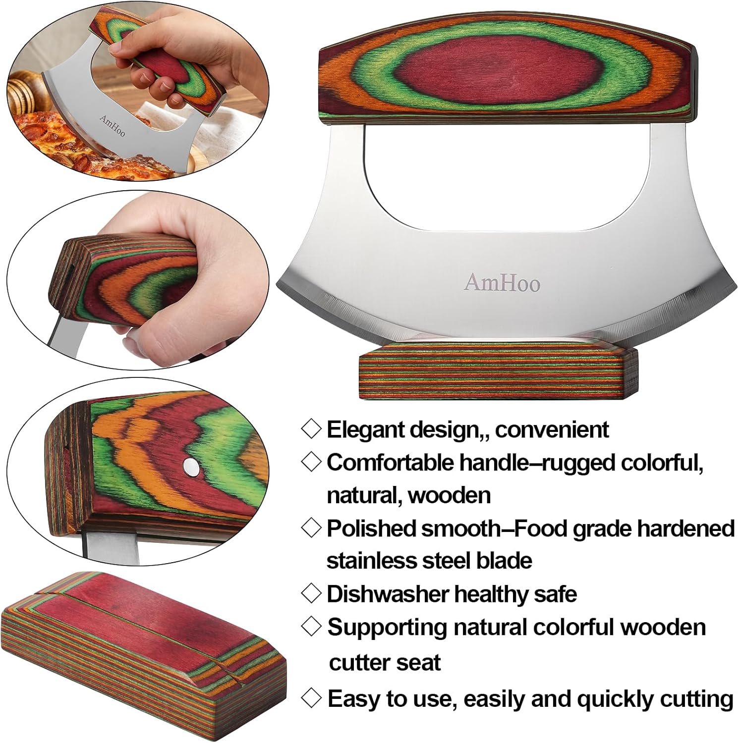 AmHoo Pizza Cutter 6.5 Inch Chef Mezzaluna Ulu Knife Handle Color Wood Grip Sharp Rocker Slicer Stainless Steel Blade Salad Onion Vegetable Chopper with Holder Base Christmas Gifts