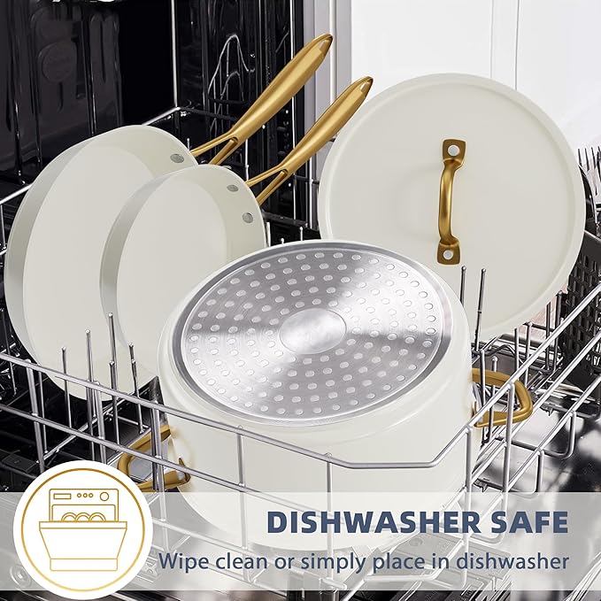 - NATURALLY NONSTICK: No more sticky or difficult-to-clean problems. The ceramic cookware set requires less oil or butter for cooking and minimal scrubbing for a spotlessly clean.