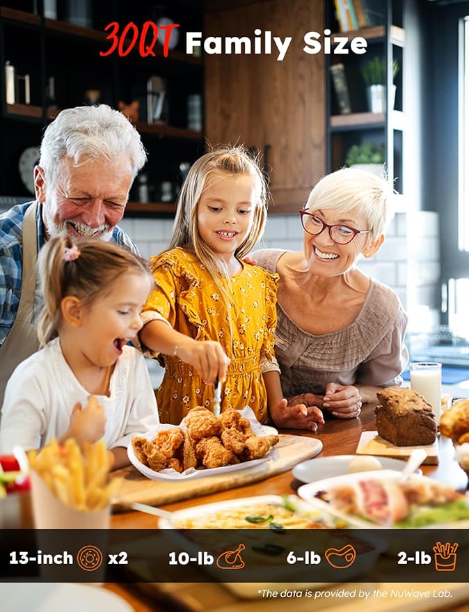 - Special Feature : ①2025 Improved Ultra-fast Convection System; ② Linear T™ Air Frying Tech; ③ True Char-Grilled Flavor; ④ 3X Faster, 2X More Even; ⑤ 35% Crispier Results, 95% Less Oil; ⑥ 12 Cooking Functions, 100 Easy-Cook Presets, 30 Memory Slots; ⑦ 10 Toast Settings, 5-Stage Cooking, 3 Sear Modes; ⑧ 30QT XL Large Capacity, 4 Adjustable Rack;, ⑨ 50-500℉, 0-100 Hours, 3 Selectable Fan Speed; ⑩ Upper and Lower Heaters Adjustable From 0-100%; Carrying-over Cooking Function; Auto Preheat, Auto Shut Off; Delay and Clock Function; Mute/Unmute, Panel Lock; 5 Heavy-Duty Accessories, PFAS Free, Dishwasher-Safe; 60+ Chef-Made Recipes. ①2025 Improved Ultra-fast Convection System; ② Linear T™ Air Frying Tech; ③ True Char-Grilled Flavor; ④ 3X Faster, 2X More Even; ⑤ 35% Crisp… See more