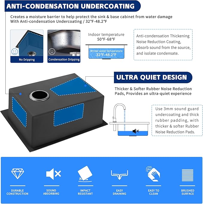 - [Premium material] The sink is built with 304 stainless steel and 18 gauge thickness for sink body, premium materials prevent from scratches, corrosion, rust, oil.