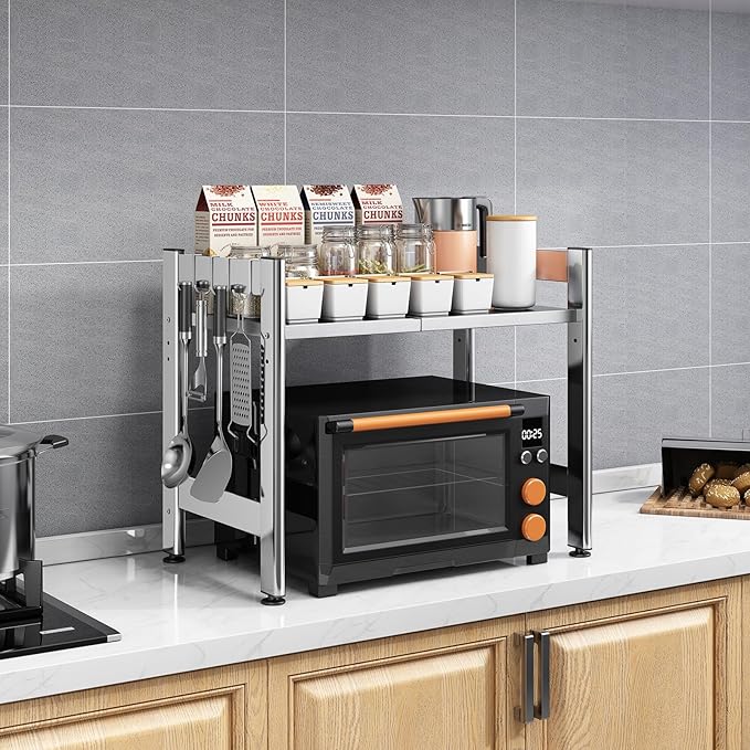 Extendable Microwave Oven Rack,Adjustable Microwave Stand Kitchen Counter Shelf Kitchen Utensils Storage, Stainless Steel 2-Tier Over Microwave Shelf Countertop Organizing Rack with 4 Hooks(S)