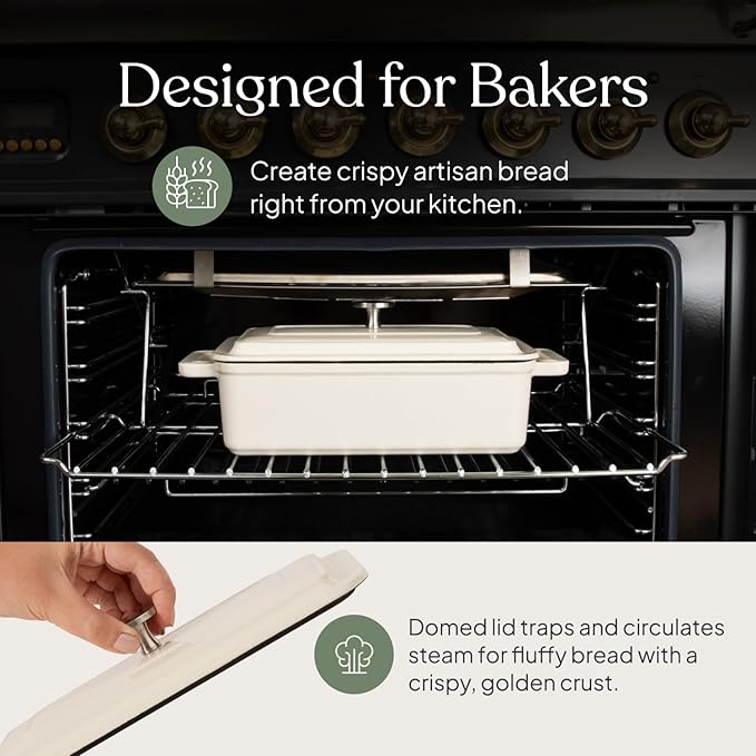 - ENAMELED CAST IRON: Built from heavy-duty cast iron, this bread oven distributes heat evenly for consistent baking. The enameled finish means no seasoning is required, making it low-maintenance and easy to clean.