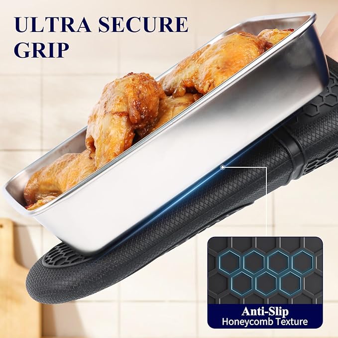- NON-SLIP FOR A GREAT GRIP: The textured silicone surface with the honeycomb pattern provides a non-slip secure grip, even when holding wet or greasy foods or cookware. Whether you're lifting a heavy roasting pan or grabbing a hot baking sheet, Kitsure cooking gloves provide excellent control and stability.