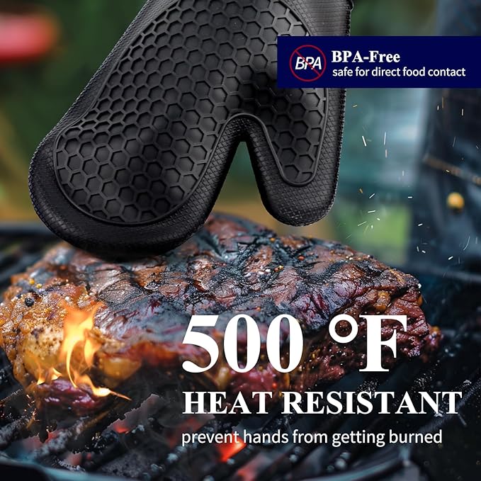 - ULTRA HEAT RESISTANCE: Featuring a heat-resistant silicone exterior and a soft cotton lining, Kitsure oven gloves offer superior protection and comfort. The oven mitts are premium, safe, and BPA-free, ensuring they can hold the food directly and withstand temperatures up to 500℉. No more burns and scalds!