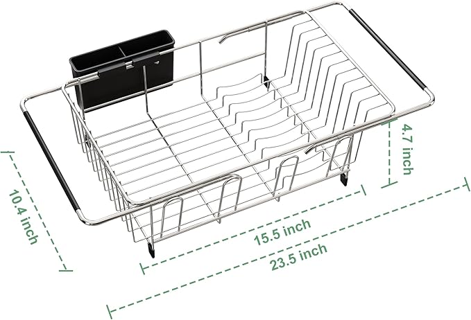 - Adjustable Supporting Bars: The supporting bar of the sink drying rack can be extended from 15.5" to 23.2", This kitchen sink rack is a great space saver that fits over most sinks. If the kitchen counter is small or narrow, the supporting bar of the dish rack can be pulled out to use over the sink, effectively saving you kitchen space and keeping it clean and dry. In addition, the non-slip rubber arms handle covers can effectively prevent the dish rack from slipping