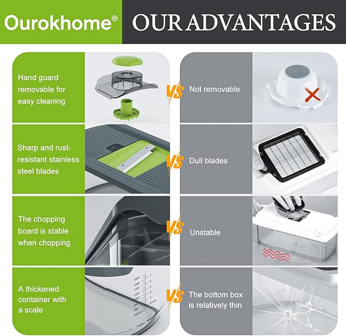 - A kitchen essential gadgets - Whether you're a novice cook or a seasoned pro, the Ourokhome 10 in 1 mandolin slicer and spiralizer is a must-have in any kitchen. It's versatile, easy and safe to use and store, and backed by our 100% satisfaction guarantee.