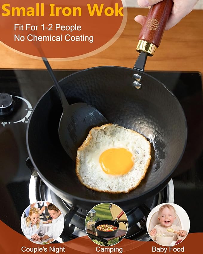 - Chinese-style Small iron wok:The 8.6-inch skillet is ideal for 1-2 servings, making it a space-saving pick for small households. With lid included, it weighs just 3.2 lbs (1.45kg). The slightly thicker walls make it more durable than standard iron woks, offering superior long-term value. Excellent for preparing baby food with healthy, chemical-free cooking