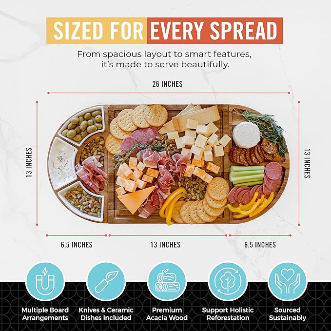 - ๐๐'๐ ๐ฎ ๐๐ผ๐บ๐ฝ๐น๐ฒ๐๐ฒ ๐ฆ๐ฒ๐ ๐ณ๐ผ๐ฟ ๐๐ฎ๐๐ ๐๐ป๐๐ฒ๐ฟ๐๐ฎ๐ถ๐ป๐ถ๐ป๐ด: The wooden serving tray comes with a host of useful charcuterie board accessories, including 4 stainless steel cheese knives and 3 white ceramic serving dishes, providing all of your hosting essentials. Impress your guests with this large charcuterie board at your next party - Motherโs Day, Memorial Day, Fatherโs Day, Independence Day, Thanksgiving, Christmas, Super Bowl, Galentines, Passover, Hanukkah, the opportunities are endless!