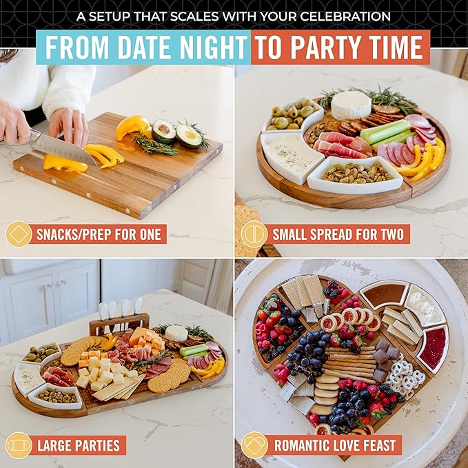 - ๐ ๐ฎ๐ด๐ป๐ฒ๐๐ถ๐ฐ, ๐ฆ๐ผ ๐ฌ๐ผ๐ ๐๐ฎ๐ป ๐๐ต๐ฎ๐ป๐ด๐ฒ ๐๐ต๐ฒ ๐๐ฟ๐ฟ๐ฎ๐ป๐ด๐ฒ๐บ๐ฒ๐ป๐: Our large, magnetic charcuterie board centers around a 13โ x 13โ square board, ideal for a small gathering, and when you attach the two magnetic semi-circle end pieces, it expands to 26" x 13โ - perfect for a large party. You can arrange the long board altogether, as a circle and square, and even as a heart shape! This flexibility lets you adjust the boardโs size and shape to match the occasion.