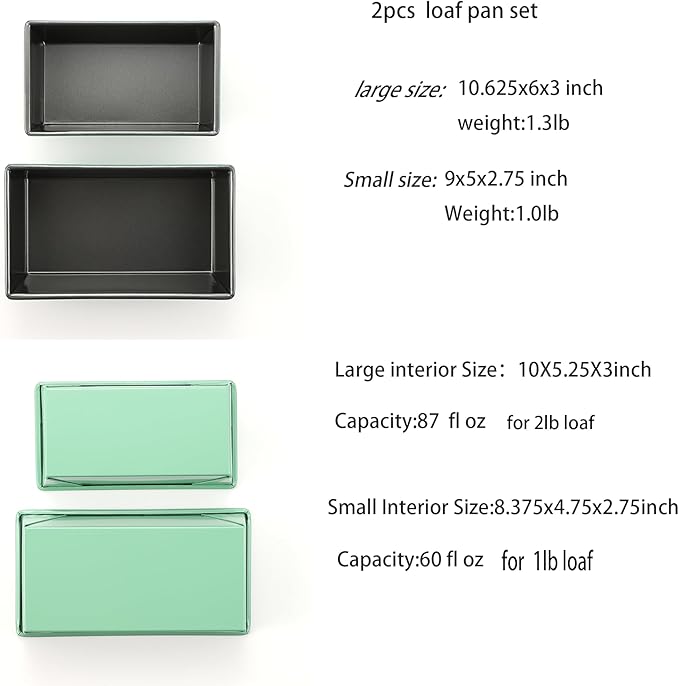 - COLORFUL DESIGN:The non-stick coating of the 2lb loaf bread baking pans is dark gray coating and the bottom is rosemary green. The colorful design of the standard loaf pans adds more delight to your kitchen.