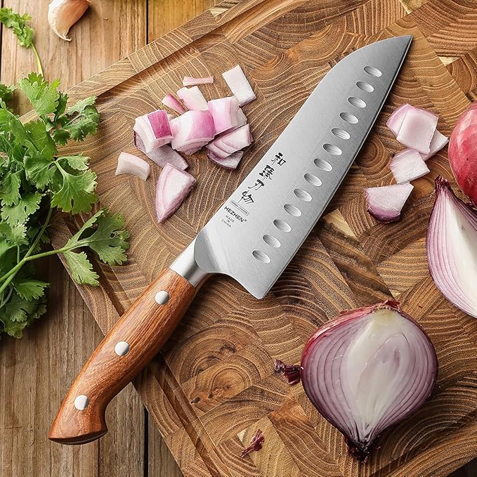 HEZHEN Santoku Chef Knife-7.3 inch Blade German DIN 1.4116 Stainless Steel-Full Tang-Red Wood Handle