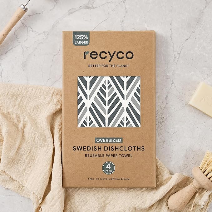 RECYCO Swedish Dishcloths for Kitchen | 4 Pack Oversized Washable Dish Rags | Large Cellulose Reusable Cleaning Paper Towels | Absorbent Counter Dish Cloth Sponge XL Kitchen Wipes, 12" L x 10" W