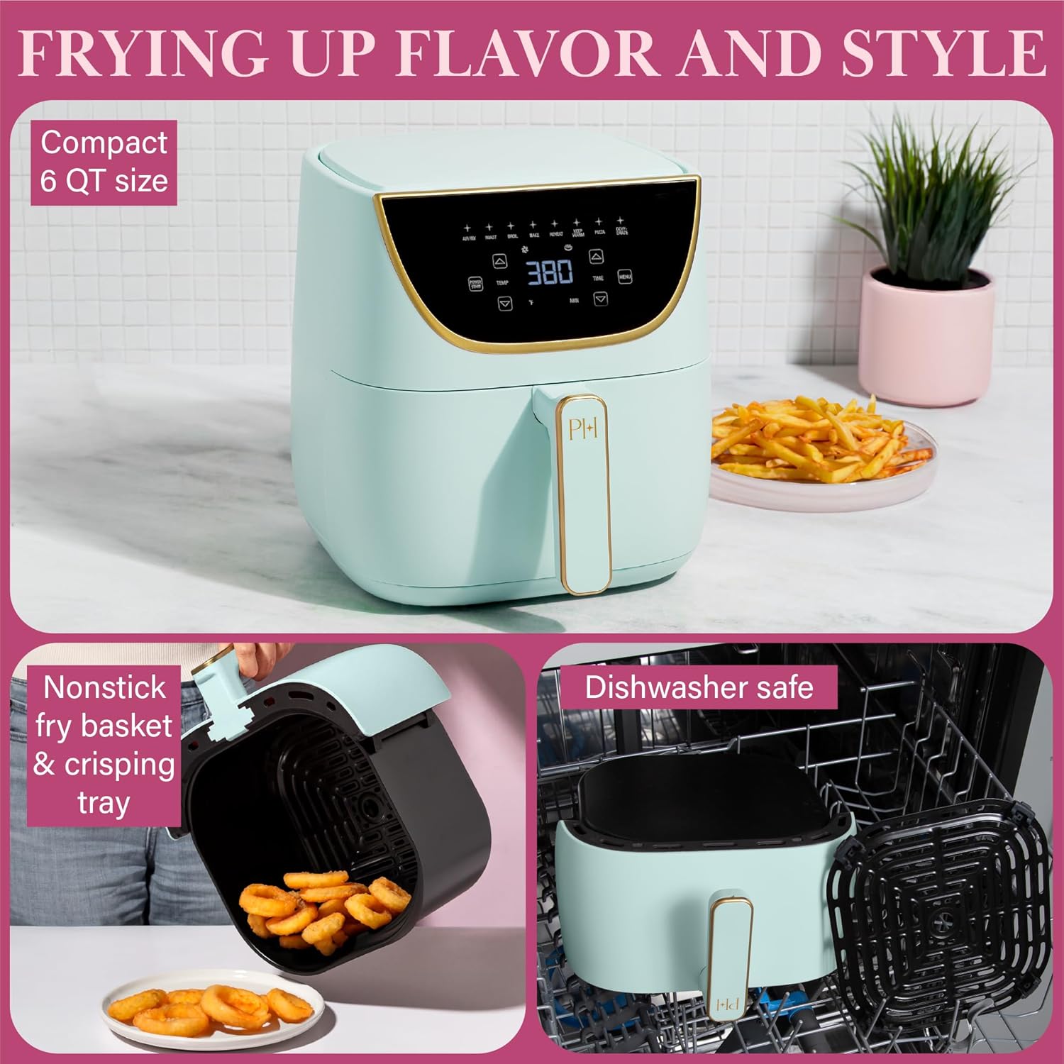 - ON DISPLAY: The Illuminated touchscreen display, on trend colors and gold accents will make your kitchen sizzle with style. Unlike most other air fryers, you will want to keep this on display.